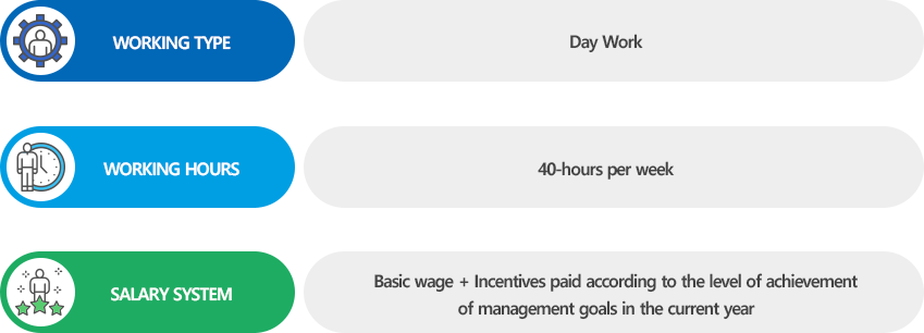 Statutory Benefits PackageWe faithfully provide National Pension, Health Insurance, Employment Insurance, and Industrial Accident Insurance for our employees.